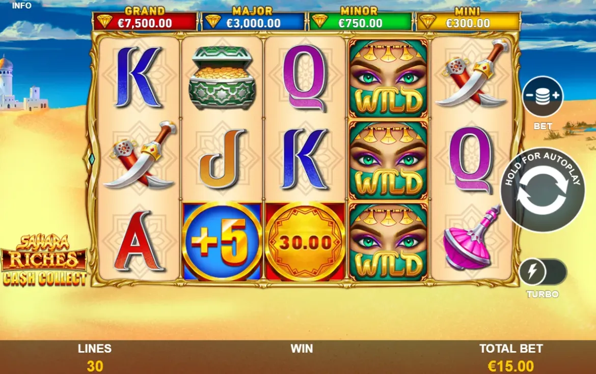 Step into a world of golden sands and hidden treasures with Sahara Riches Cash Collect by Playtech. This vibrant slot transports players to the heart of the Sahara Desert, where dazzling symbols and innovative features await on a classic 5-reel, 3-row grid with 30 fixed paylines. With its captivating Arabian theme, medium volatility, and a top prize of up to 500x your stake, Sahara Riches Cash Collect blends traditional slot gameplay with exciting bonus mechanics. Whether you’re a casual spinner or chasing big jackpots, this Playtech release promises an engaging adventure packed with cash coins, free spins, and the thrilling Cash Collect feature that can unlock instant wins and four fixed jackpots.